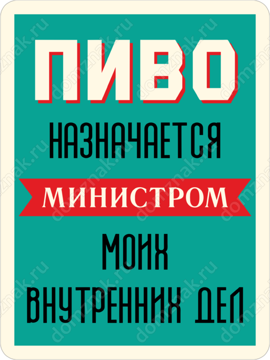 Табличка «Пиво назначается министром моим внутренних дел» изготовлена из пластика ПВХ, толщиной 4 мм. Изображение наносится по технологии УФ-печати. Табличка предназначена для использования как в помещении, так и на улице.